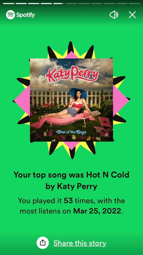 But what Spotify doesn’t know is that my listening list is somewhat skewed by the fact that I have a playlist on my taxi of songs that the children have requested. So when it tells me that “Hot and Cold” by Katy Perry is my favourite song of the year, they couldn’t be wider of the mark. Just because it’s practically on repeat – I’ve heard it 53 times this year, more than enough for any sane person, with March 25th being a particularly dark day – it doesn’t mean that I’m the world’s biggest KP fan. The song is there at the request of a group of 4-11 year olds who are my company for 40 minutes every school day.