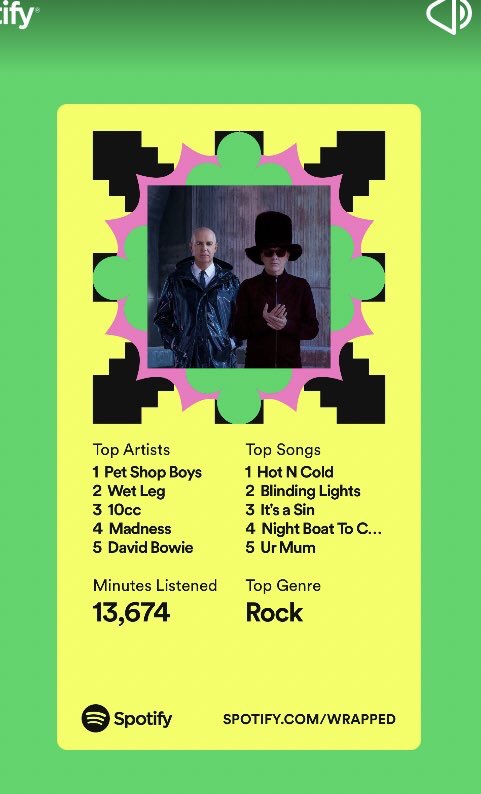 But while the Pet Shop Boys are my number one listened to artist of the year, the decades are fully covered by the fact that my top 5 also includes David Bowie from the 1970s and Wet Leg from the last two years. I do try to sneak one or two of the more child-friendly songs on to the taxi playlist, with little success. They like “Starman” and “Baggy Trousers,” but usually they can see past my attempts to introduce them to proper music.
