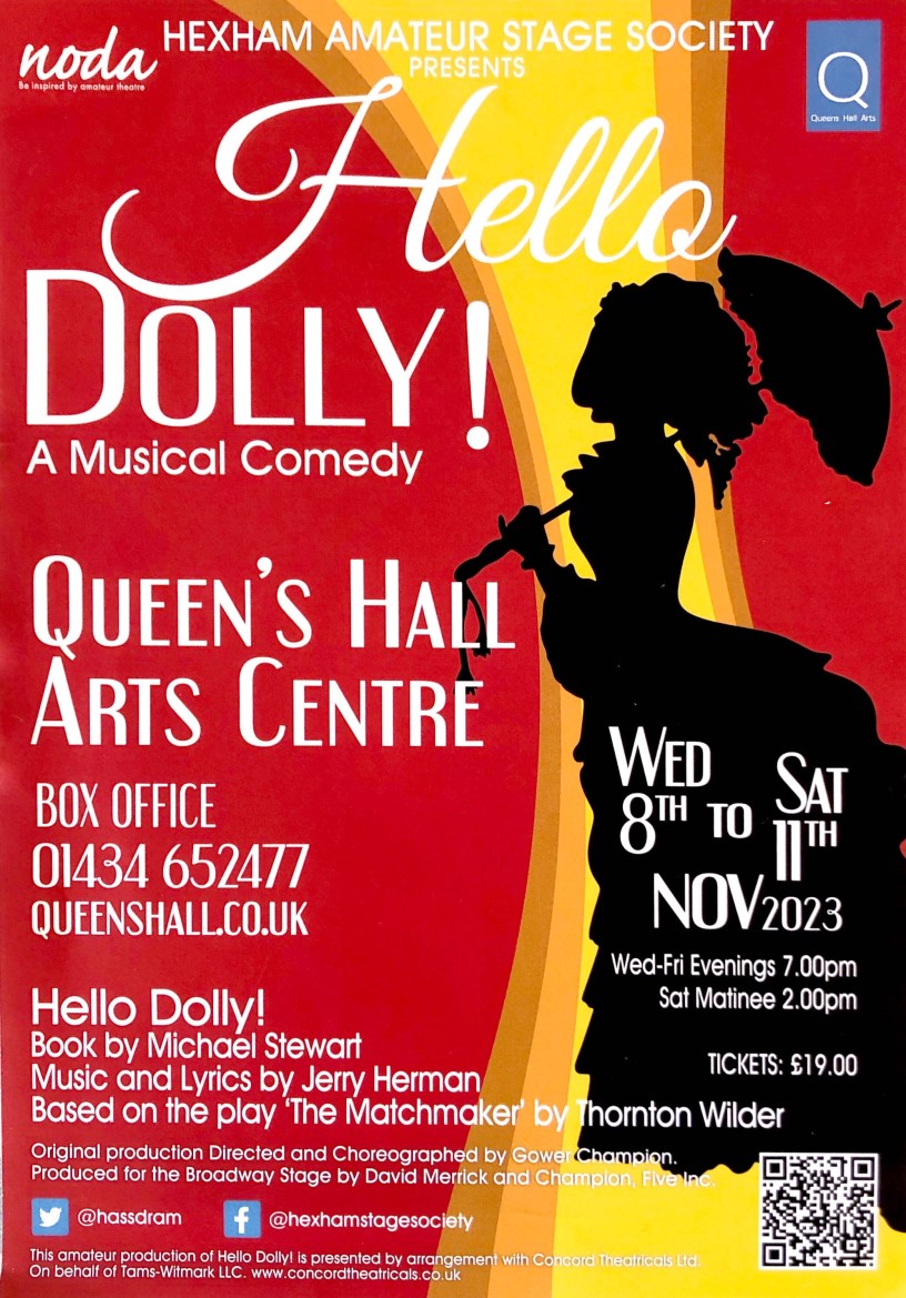 Hello Dolly opens at the Queens Hall Theatre in Hexham on Wednesday 8th November and runs until Saturday 11th (matinee only). The box office is open from 10am – 12 noon and 1pm – 4pm, Monday to Saturday. Or you can call them on (01434) 652477
