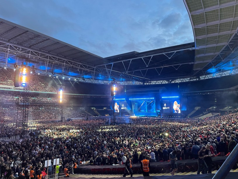 It bumped along the potholed roads for about fifty minutes, so when we got to Wembley we rewarded ourselves with a pint of something fizzy in a nearby pub. We had planned to get into the venue as soon as we could because we had standing tickets. Now I’ve always wanted to step onto the pitch at Wembley. What football-loving English person wouldn’t? I had pictured us in the mosh pit, bouncing up and down to ‘Highway to Hell” or “Whole Lotta Rosie”, and to some extent that is exactly what we did.